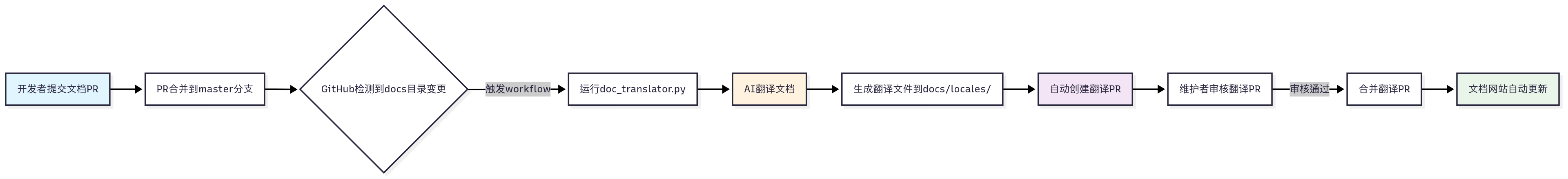 我在github workflow里面配置了,只要docs目录下面发生更改,就会触发文档翻译的工作流。文档翻译工作流会调用AI,把文档翻译了,并且输出到docs/locales目录下面,接着创建一个新的文档翻译pr。