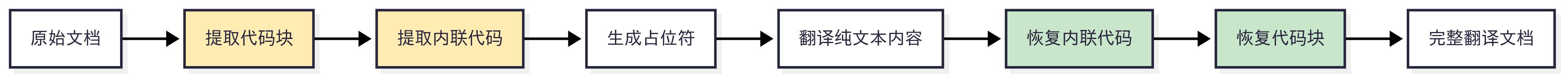 举个例子,代码块在发送给AI模型之前,被替换为了__CODE_BLOCK_xxxxxxx 这样一个标志符,接着在AI翻译结束之后,再把他替换回来。