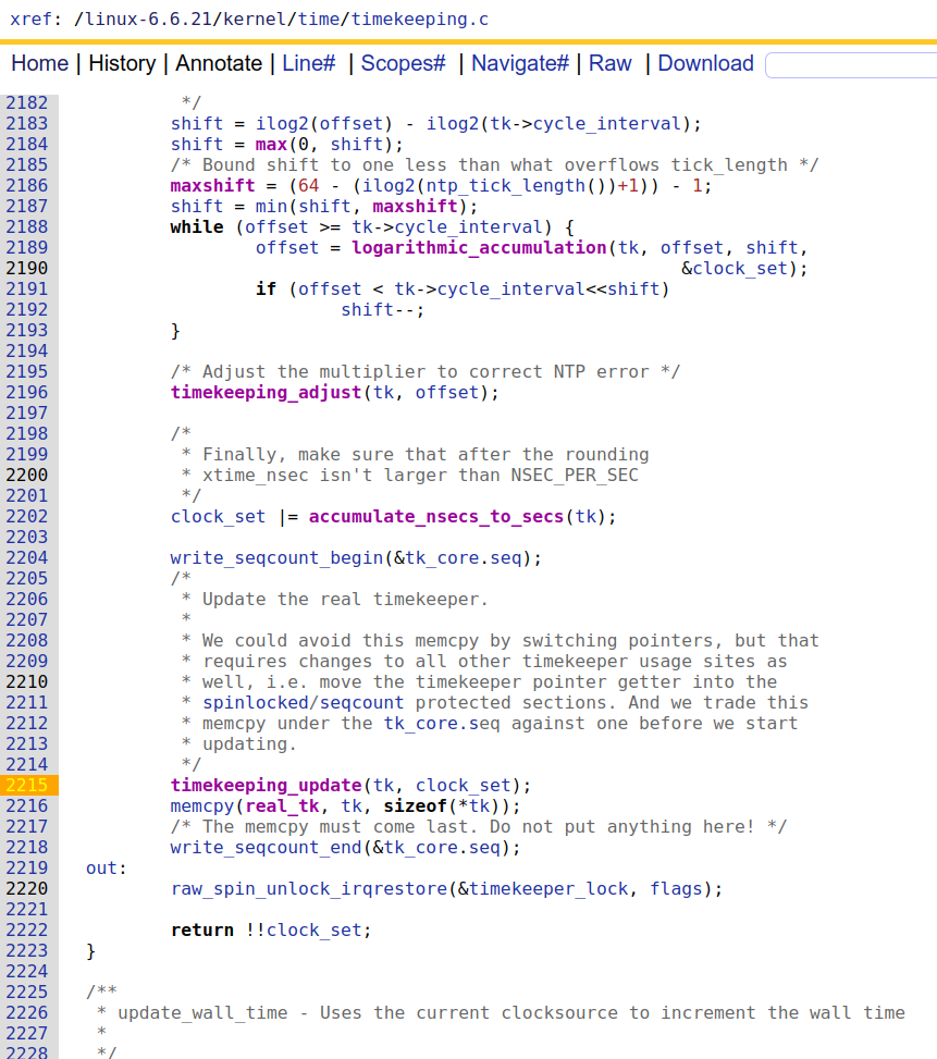 https://code.dragonos.org.cn/xref/linux-6.6.21/kernel/time/timekeeping.c?fi=update_wall_time#2150