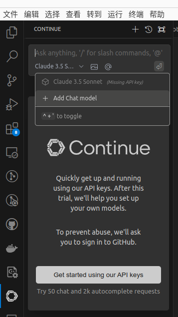 接着,回到vscode,点开左边那栏的Continue,设置添加聊天模型: