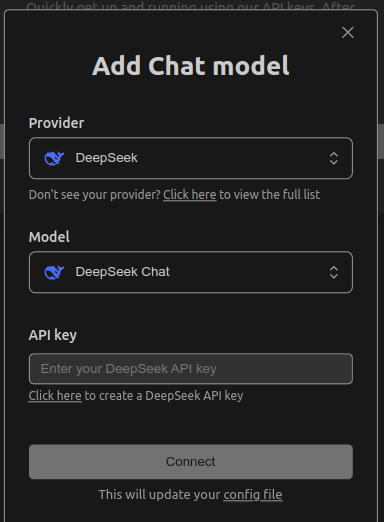 添加deepseek chat(注意,24.9.5之后,deepseek宣布了deepseek code和deepseek chat合并,因此直接写chat就行了),把你的api key填进去