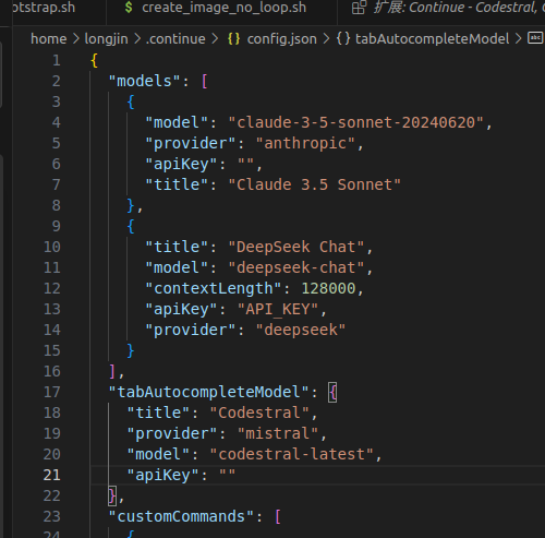 这样的话我们就设置好了聊天的模型。接着会看到config.json。我们在这里面设置代码补全模型: