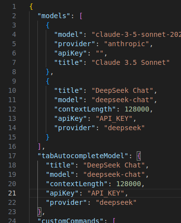 把deepseek的那些配置,复制到“tabAutocompleteModel”的里面就行:(注意API_KEY替换成你的apikey)